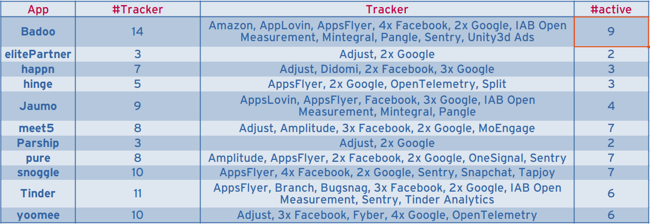 In terms of the sheer number of trackers per app, there has been little change compared to the previous test for most apps. Peak values exceeding ten trackers are still not unusual. Likewise, the observable activity of individual trackers remains relatively high. That said, there are also some positive observations: the Parship and elitePartner apps (which are essentially technically identical and operated by the same company) include only three integrated trackers. Two of these are Google analytics and crash-reporting trackers—Crashlytics and Firebase Analytics—which are present in virtually every Android app, as well as the analytics-focused tracker Adjust. No additional modules dedicated exclusively to advertising or explicit user behavior analysis could be identified. Compared to the previous test, in which a total of six trackers were found in the Parship app, this represents a noticeable reduction. As a result, these two apps could almost be considered exemplary in this category.